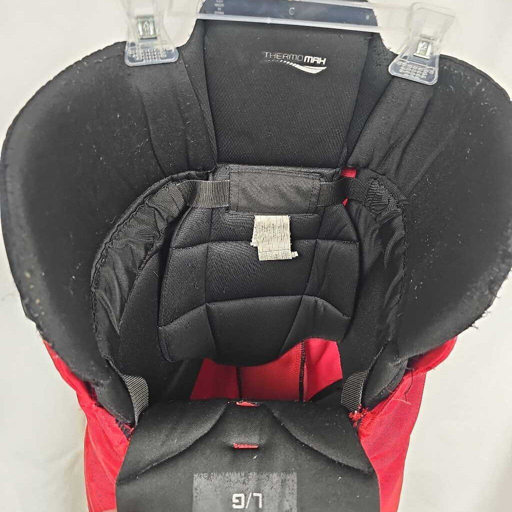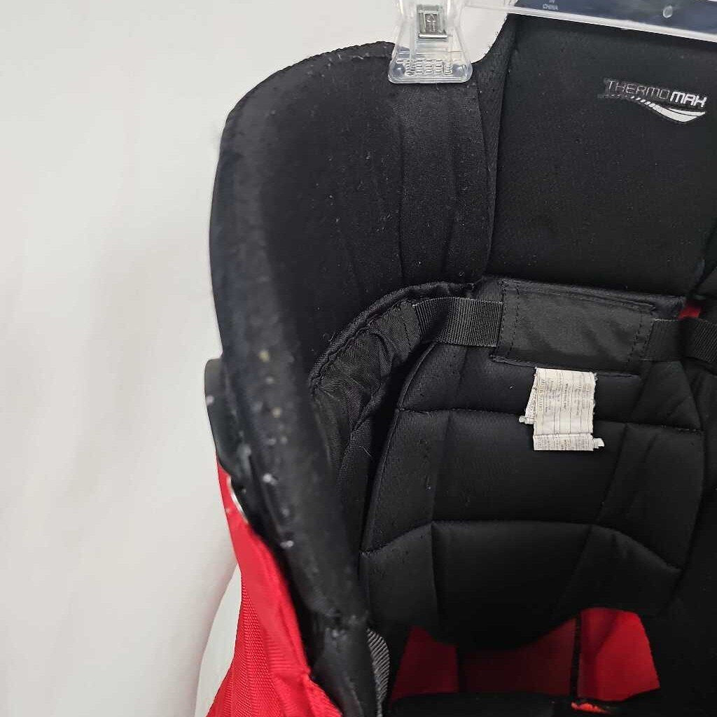 Red pants with white side stripe and Boston Junior Terriers logo on right thigh.