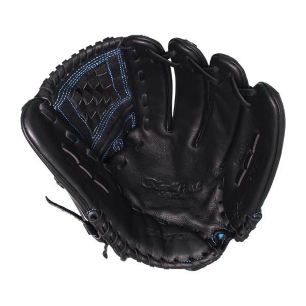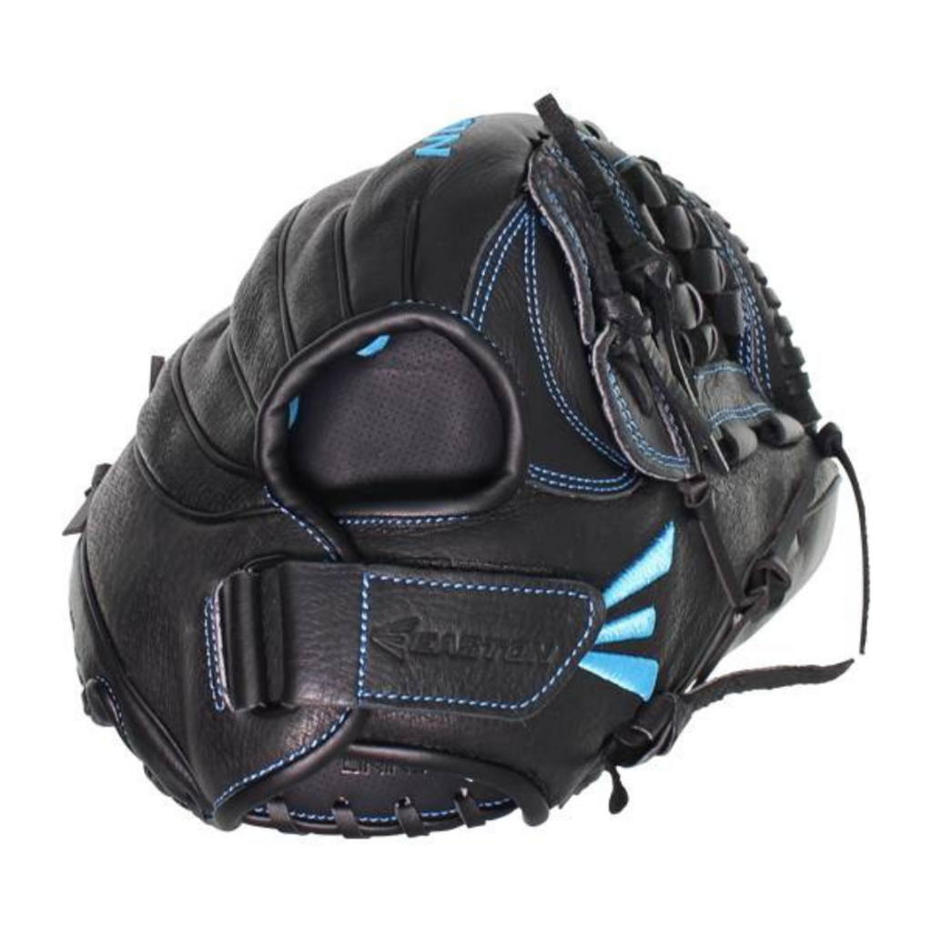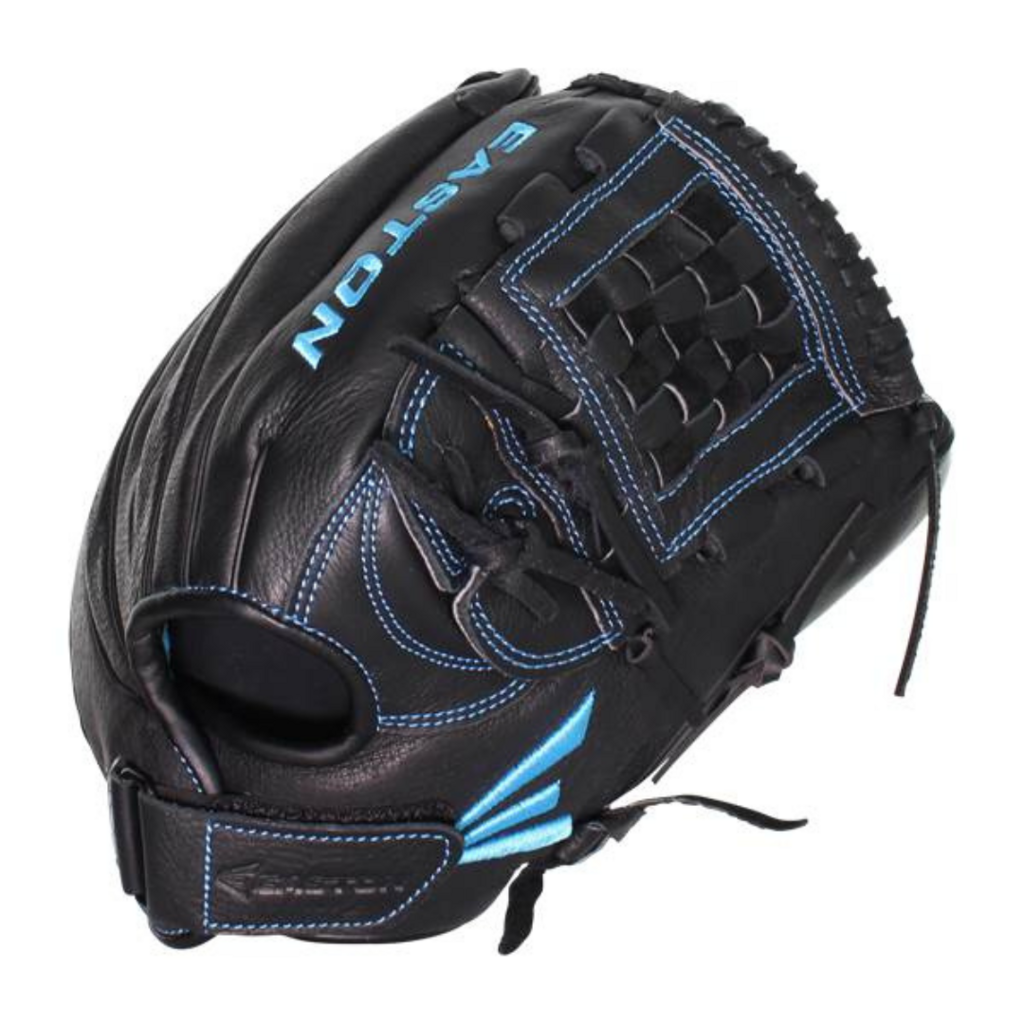 This Easton Black Pearl Fastpitch Softball Glove: BP1200FP features a 12.5-inch pattern, a split woven web with a deep pocket, and a solid black design with light blue accents.