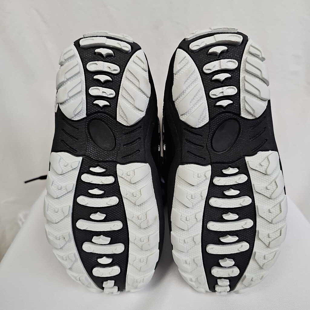 Black boots with white graphics and white soles. Budget friendly boots to get the little one on the mountian!