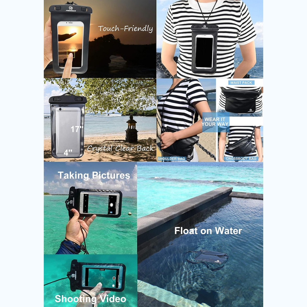 - This set also includes a must have IPX8 Certified Waterproof Phone Case (3.9" x 6.7"). This amazing dry cell phone case features a very simple snap and lock access that has dual-sided clear windows that allow you to text, talk on the phone, take pictures and video while still inside the case. Suitable for phones up to 6.5 Inches of diagonal screen size.
