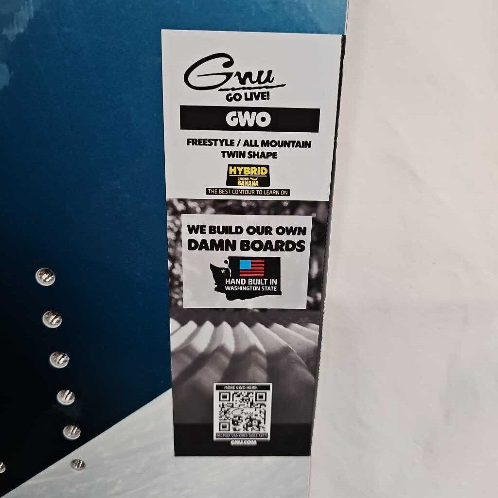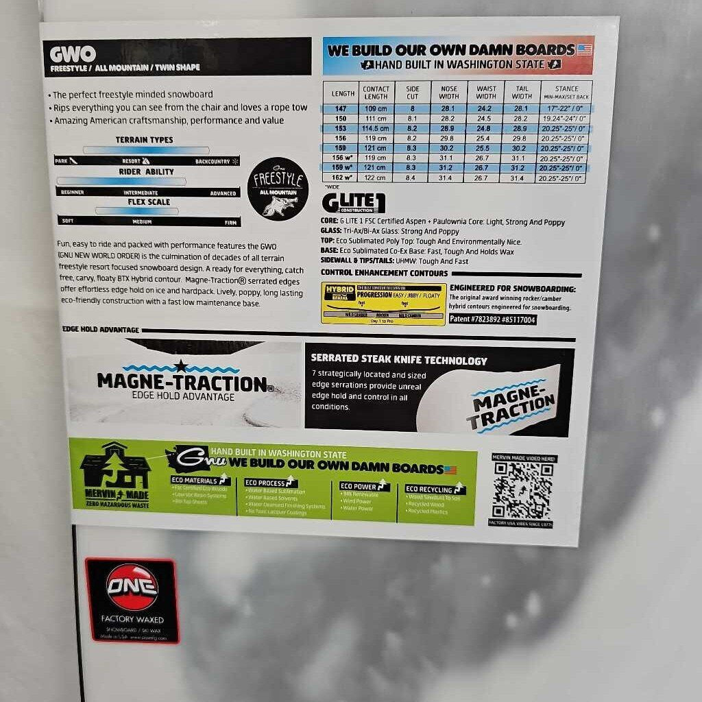 Gnu Gwo (23/24) Men's Snowboard Get ready to dominate the slopes with the GWO (GNU NEW WORLD ORDER) snowboard - an epic combination of playful performance and all terrain freestyle design. Boasting a catch-free, carvy, and floaty BTX Hybrid contour, this board is perfect for any adventure. The Magne-Traction® serrated edges ensure effortless grip on icy and hard-packed snow. And with a lively and eco-friendly construction, as well as a fast and low maintenance base, you'll be shredding with style and ease.