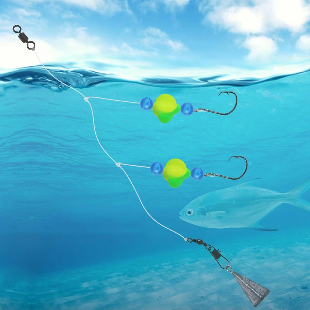 - Add Possibility of Biting of Fish - One fishing line with two fishing rigs and two pompano float. Every Pompano Float have two bead, one is on the bottom and one is on the top, which is used to attract attention from fish. Bright pompano float can rotate on the water to keep it moving steady so fish can easily to bite it.