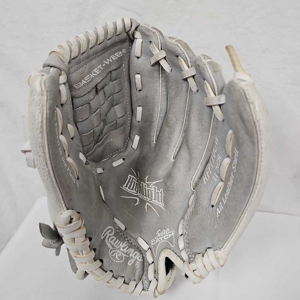 Right hand throw, fits left hand. Fastpitch softball glove, features Sure Catch notch. Gray & white. Soft material, broken in. Model HFP110GW