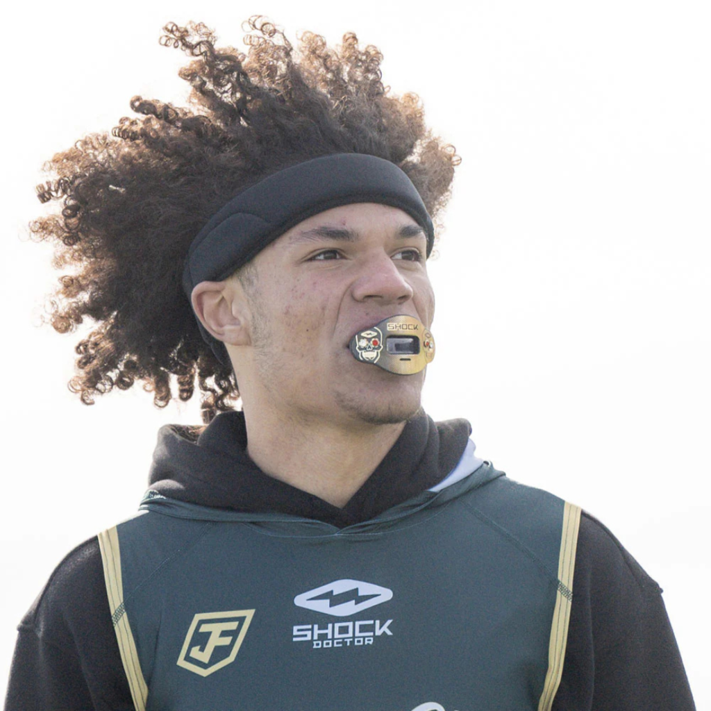Take a deep breath with 10% more flow capacity via our AirFlow breathing channel. The updated design and platform relax the jaw and prevent teeth from blocking the breathing channel, adding more flow capacity. Our flexible, proprietary Shock Doctor polymers and integral bite pads ensure max comfort and easy, no-mold fit. No more "winded" in the end zone.
