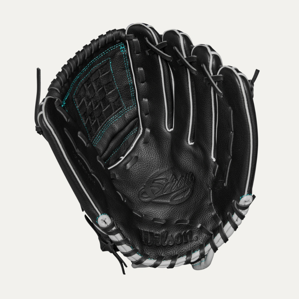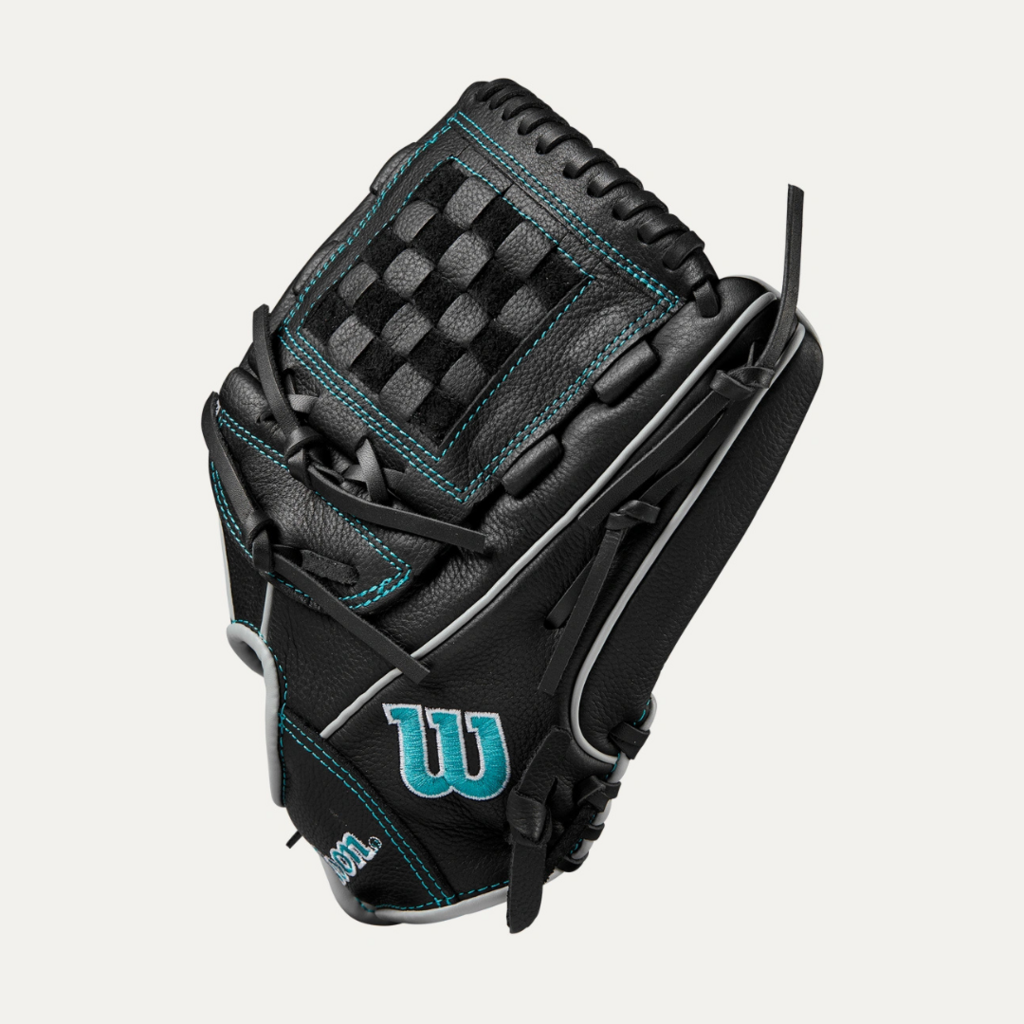 The 2024 A500™ Siren™ 12” Youth Infield Glove features a Two-Piece Closed Basket Weave Web to help young softball players improve their fielding skills at any position. The Black and Teal design is lightweight and game-ready right away, and the 12” glove can manage infield or outfield work. A Quick-Fit Wrist Strap with an elastic band ensures a secure fit.