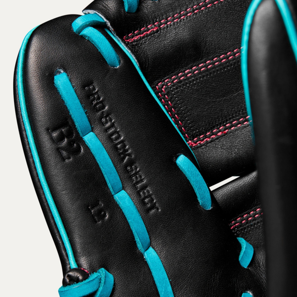 A 12” pitcher’s baseball glove with Black Pro Stock® Select Leather and a Closed 2-Piece Web to conceal pitch grips.